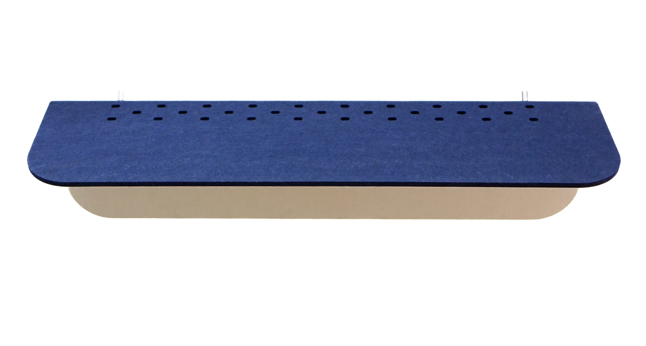 A hanging luminaire with a characteristic visor shape made of 12 mm thick PET felt. On the inside, the material has been lined with white wool, which acts as an effective light reflector. The combination of materials used gives the lamp high acoustic insulation, which allows for effective sound absorption in its surroundings.