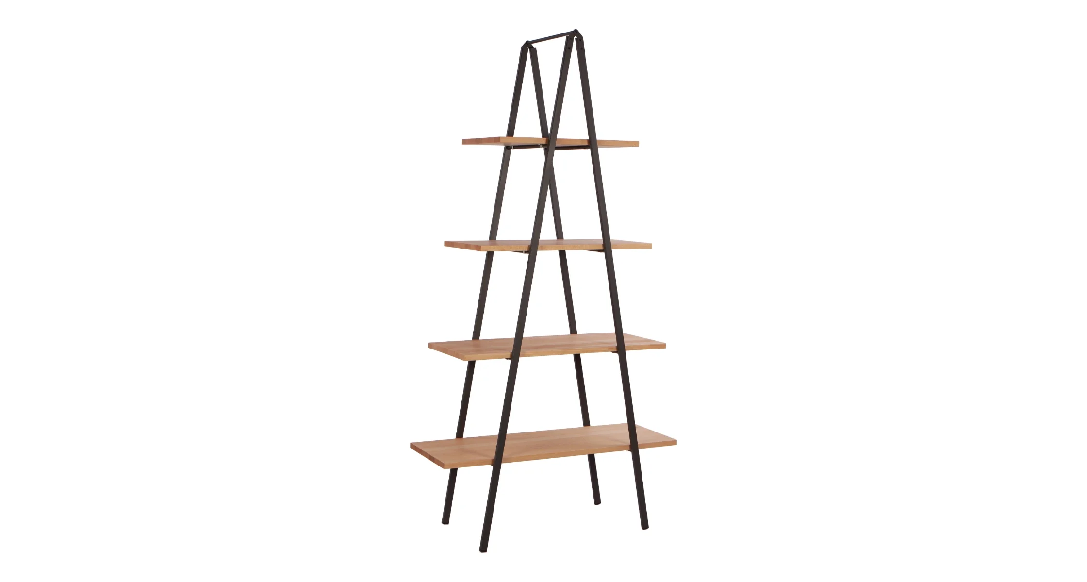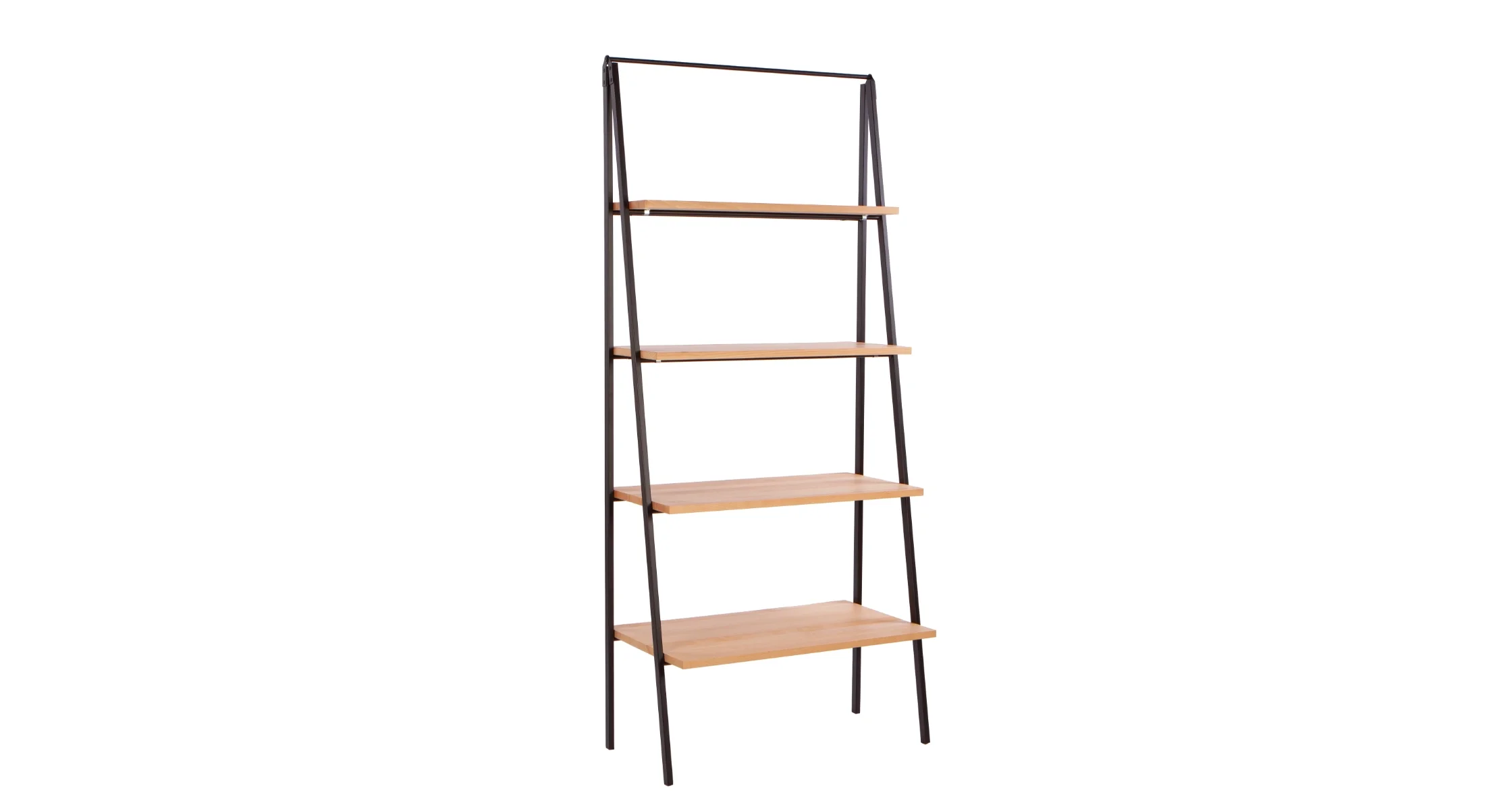 RAKKE is a ladder-style shelving unit made of black metal side profiles connected by a top crossbar. The product features four shelves of varying depths, made of boards veneered in natural oak, black oak, or American walnut. Shelves are mounted between supports that taper towards the top. Free-standing structure with legs equipped with floor protection caps.