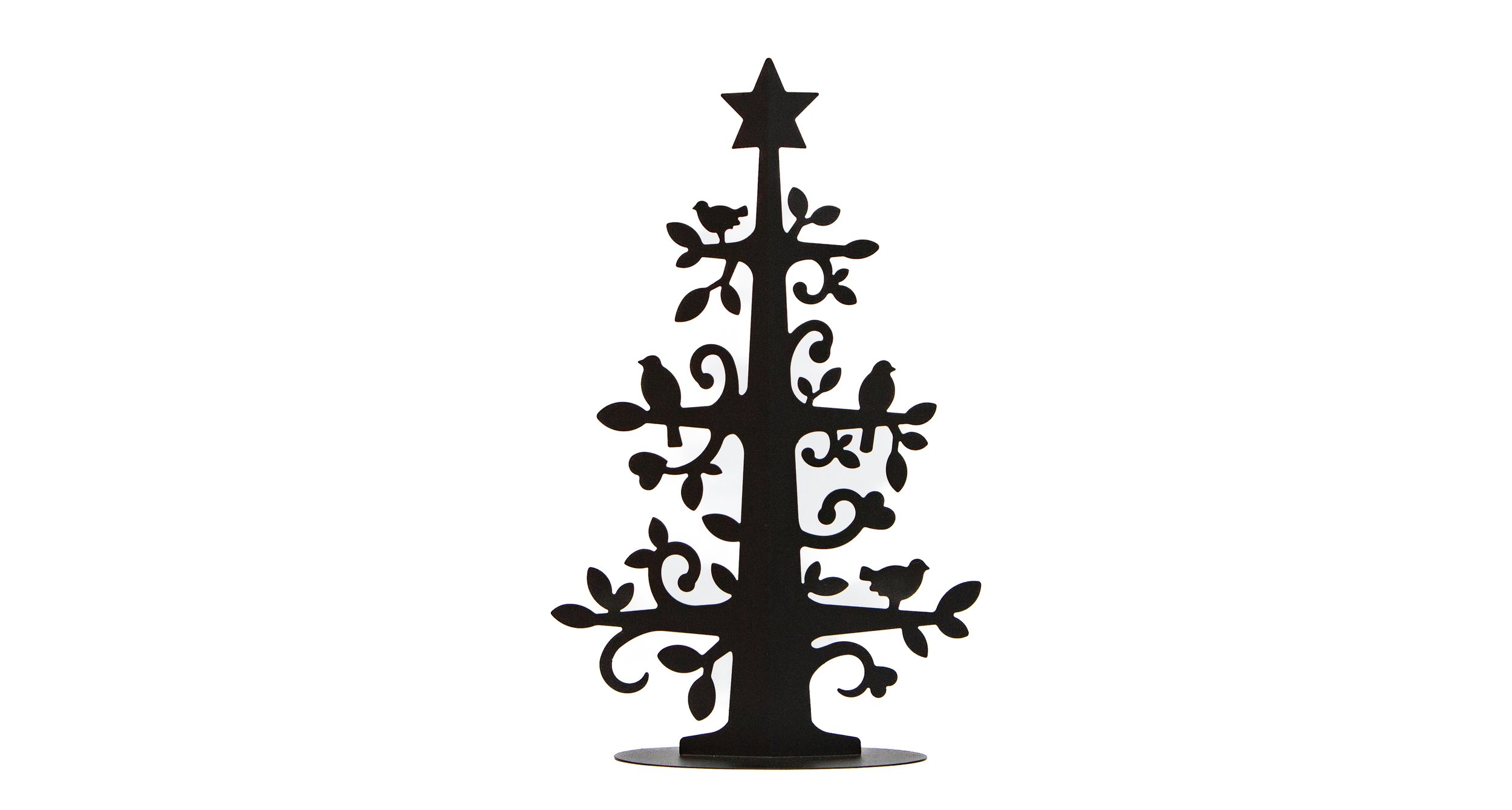 Decoration made of 1 mm thick steel sheet, powder-coated in any color. The product features precise cut-outs depicting floral motifs and silhouettes of birds perched on branches. The unit is topped with a star and mounted on a circular flat base.