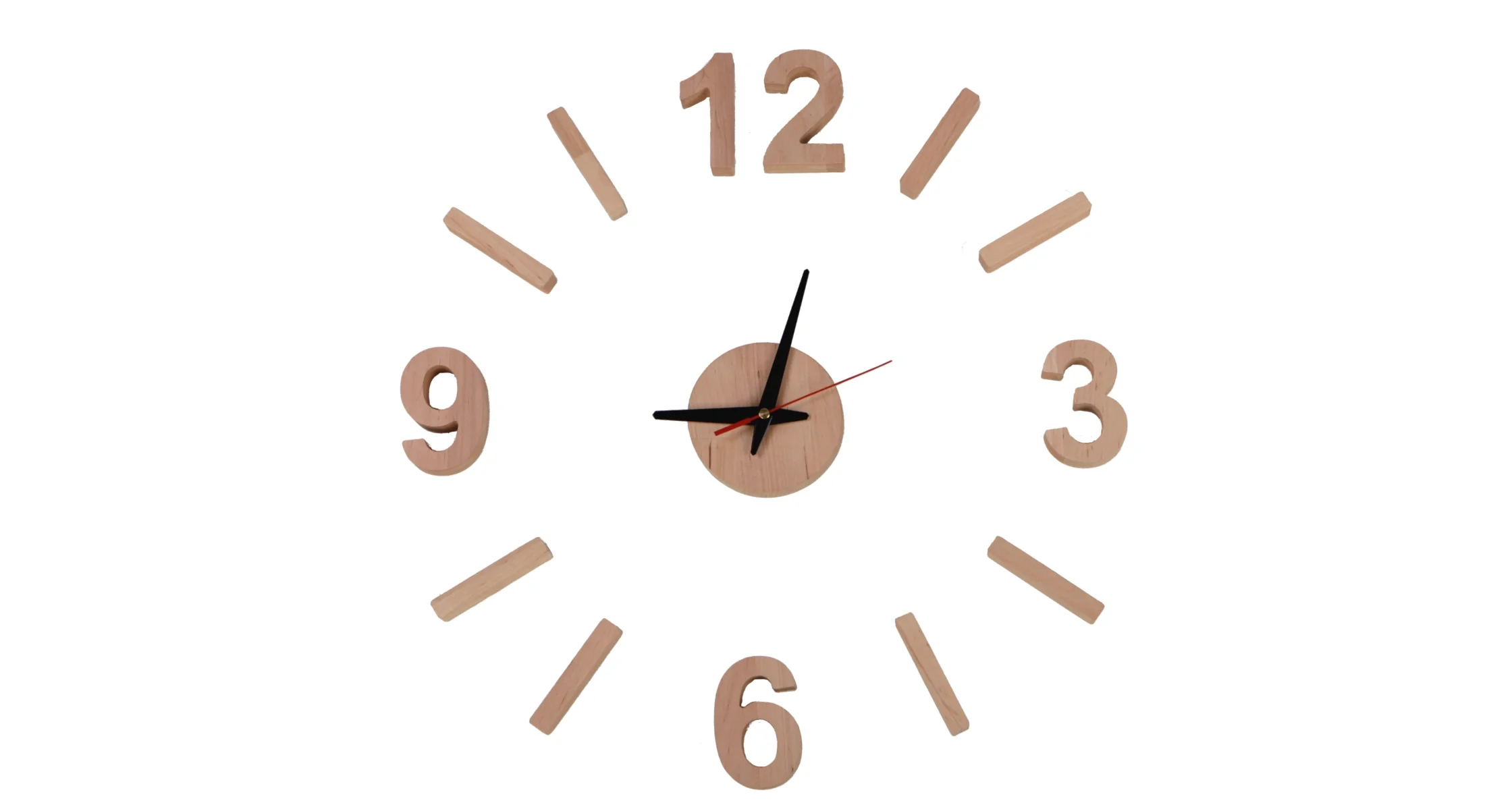 The clock is made of solid alder wood with a natural finish. The clock comes in the form of separate elements, allowing the indices to be arranged according to your preferences. The set includes a template that allows for even spacing of the markers according to the suggested layout.