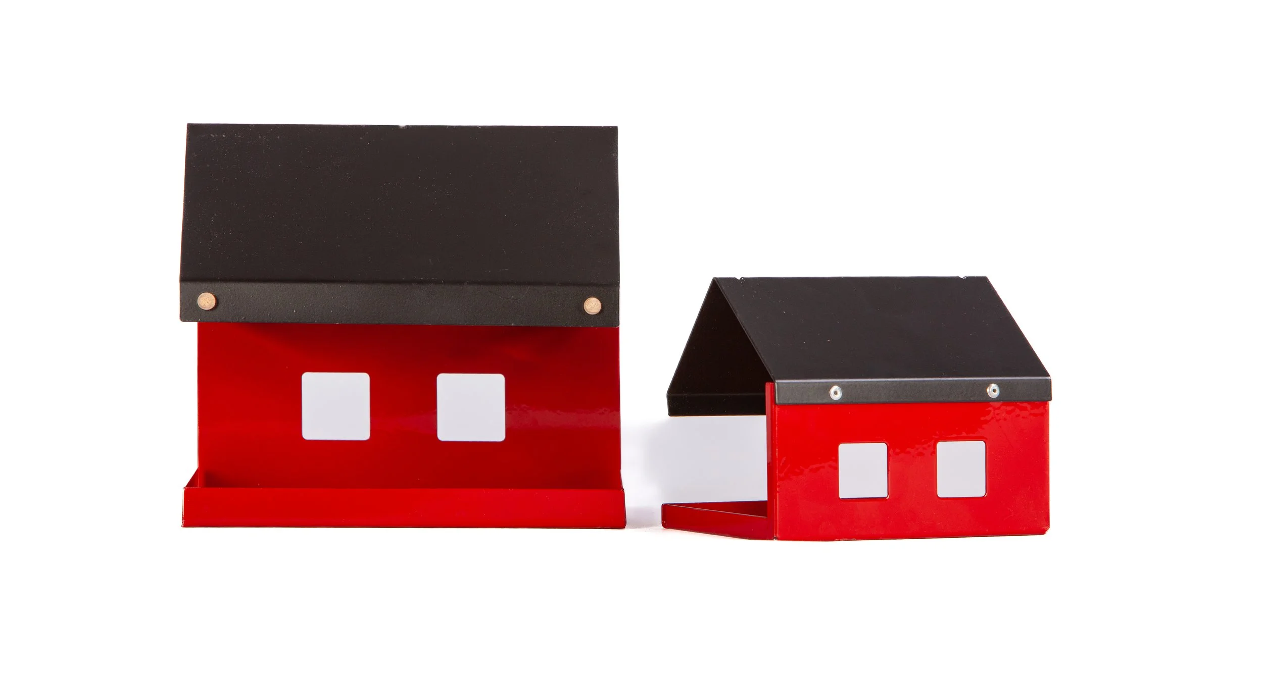 A birdhouse made of black powder-coated steel sheet. The structure has the form of a minimalist house with a gabled roof and two windows in the front wall. A horizontal perch is mounted below the entrance to facilitate landing for birds.
