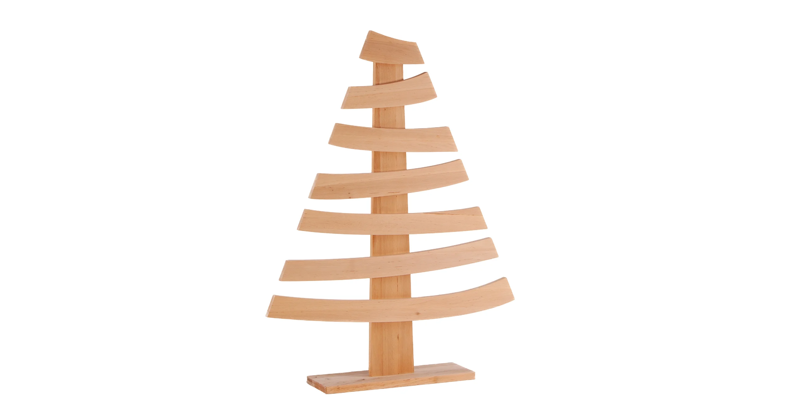 Decoration made of 10 mm thick beech wood. The structure consists of a vertical trunk and horizontally mounted, slightly curved slats of varying lengths, tapering towards the top. The entire unit is fixed to a rectangular stabilizing base.