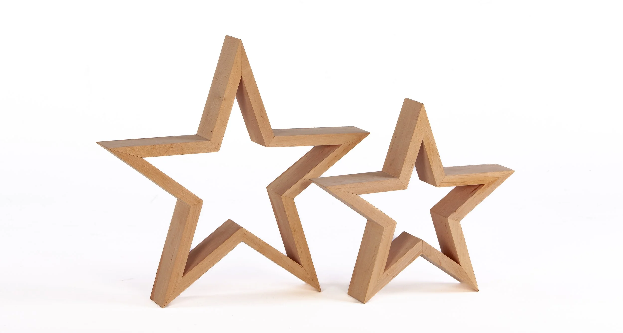 A set of two decorative figurines in the shape of five-pointed star outlines in different sizes. The product is made of solid beech wood with a natural finish. The wide side profile ensures the stability of the figurine when placed vertically on flat surfaces.