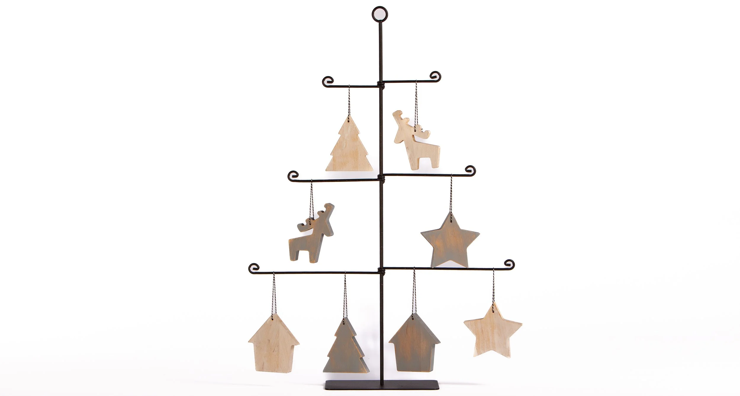 Decorative stand made of black steel wire in the form of a simplified tree outline. The structure features transverse arms ending in decorative curls, each can be used to hang any decorations. The product is mounted on a flat metal base.