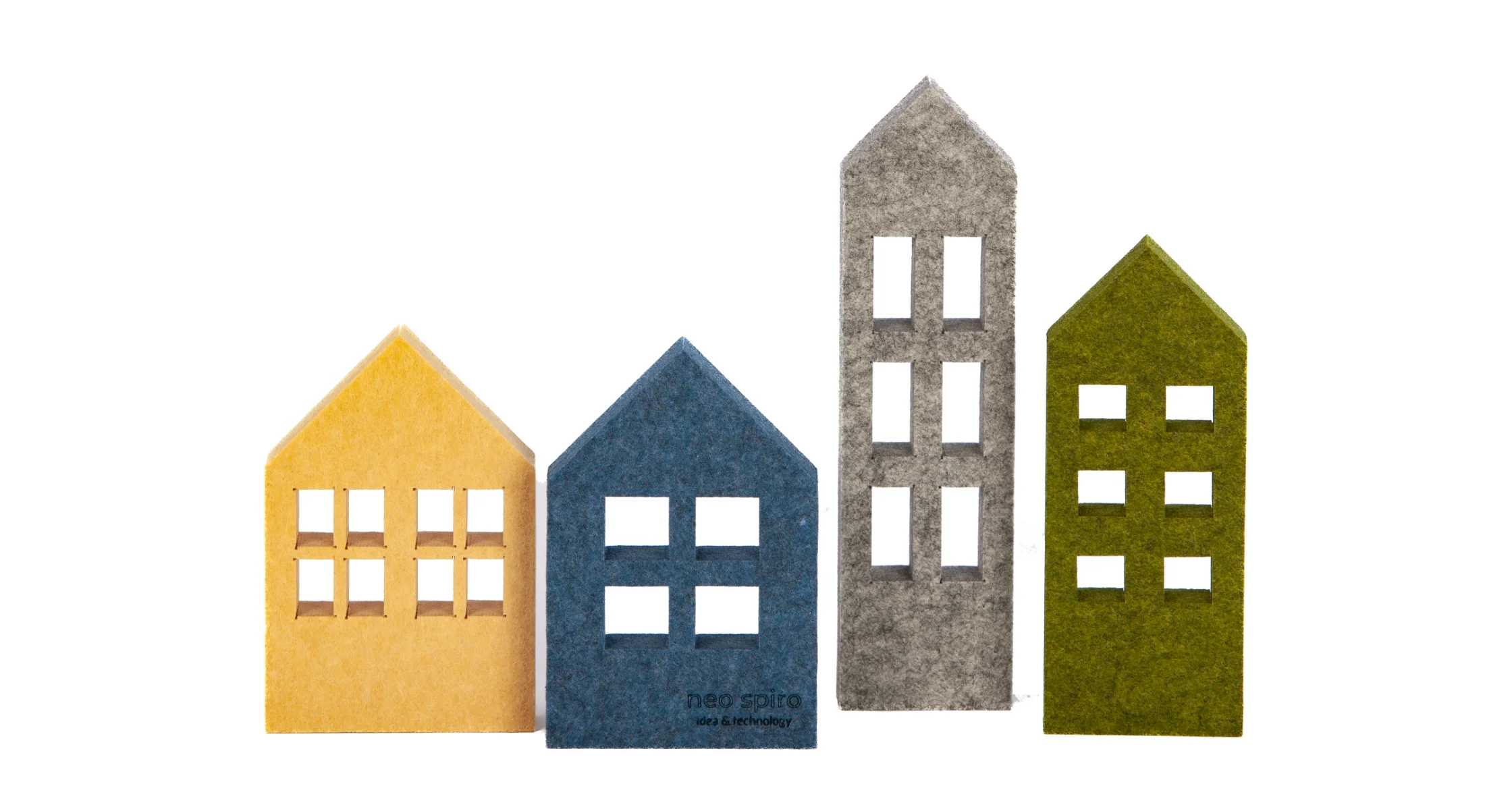 A set of four minimalist house-shaped decorations, made entirely of PET felt. Various heights and precisely cut window openings allow for creating custom spatial arrangements. The natural felt structure makes each piece unique, bringing a warm atmosphere to the room.