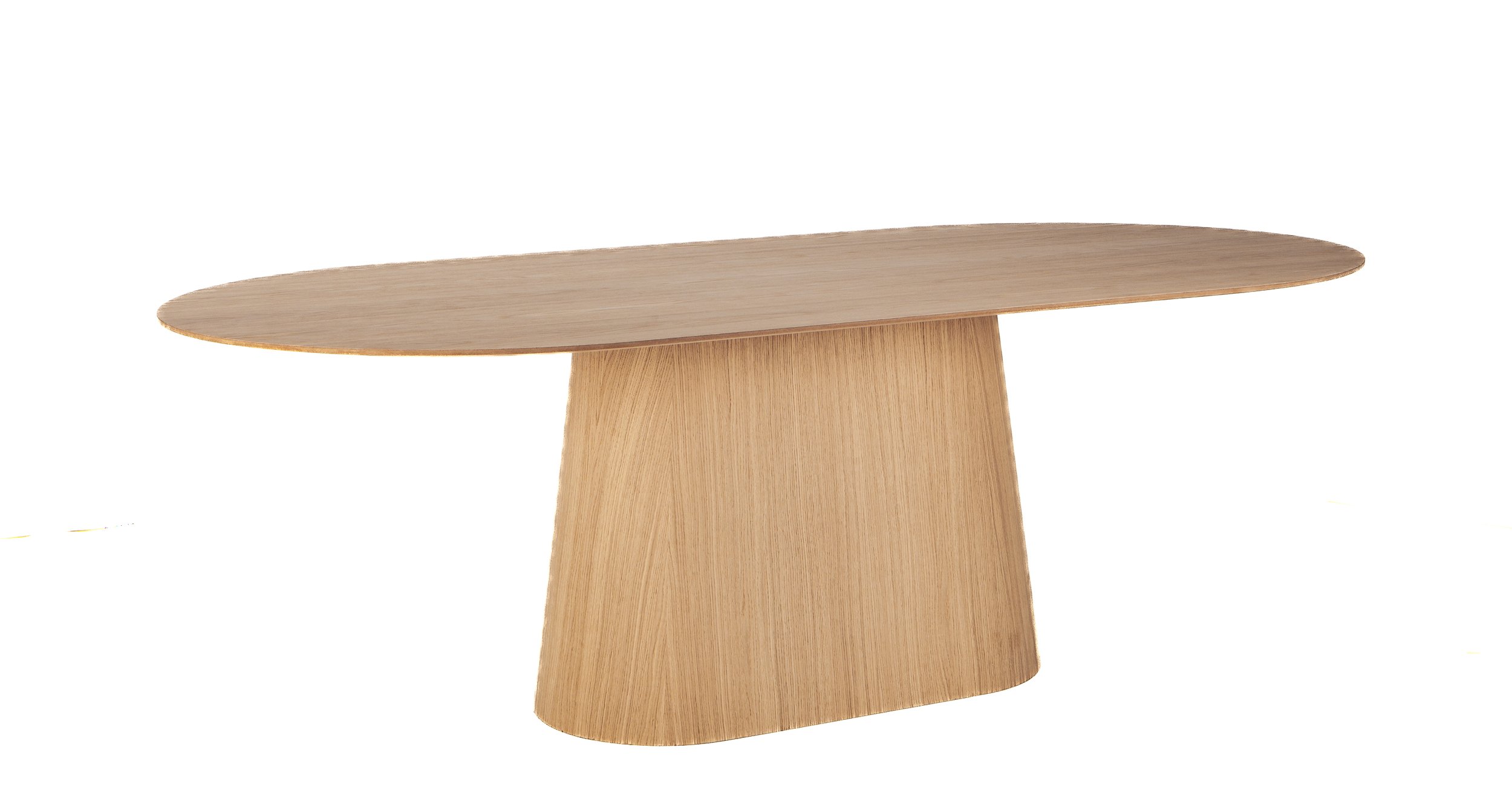 The GAMU table is made entirely of oak veneer. The elliptical tabletop rests on a central base with an oval shape that tapers towards the top. The table is available in two finishes: natural oak and black oak.