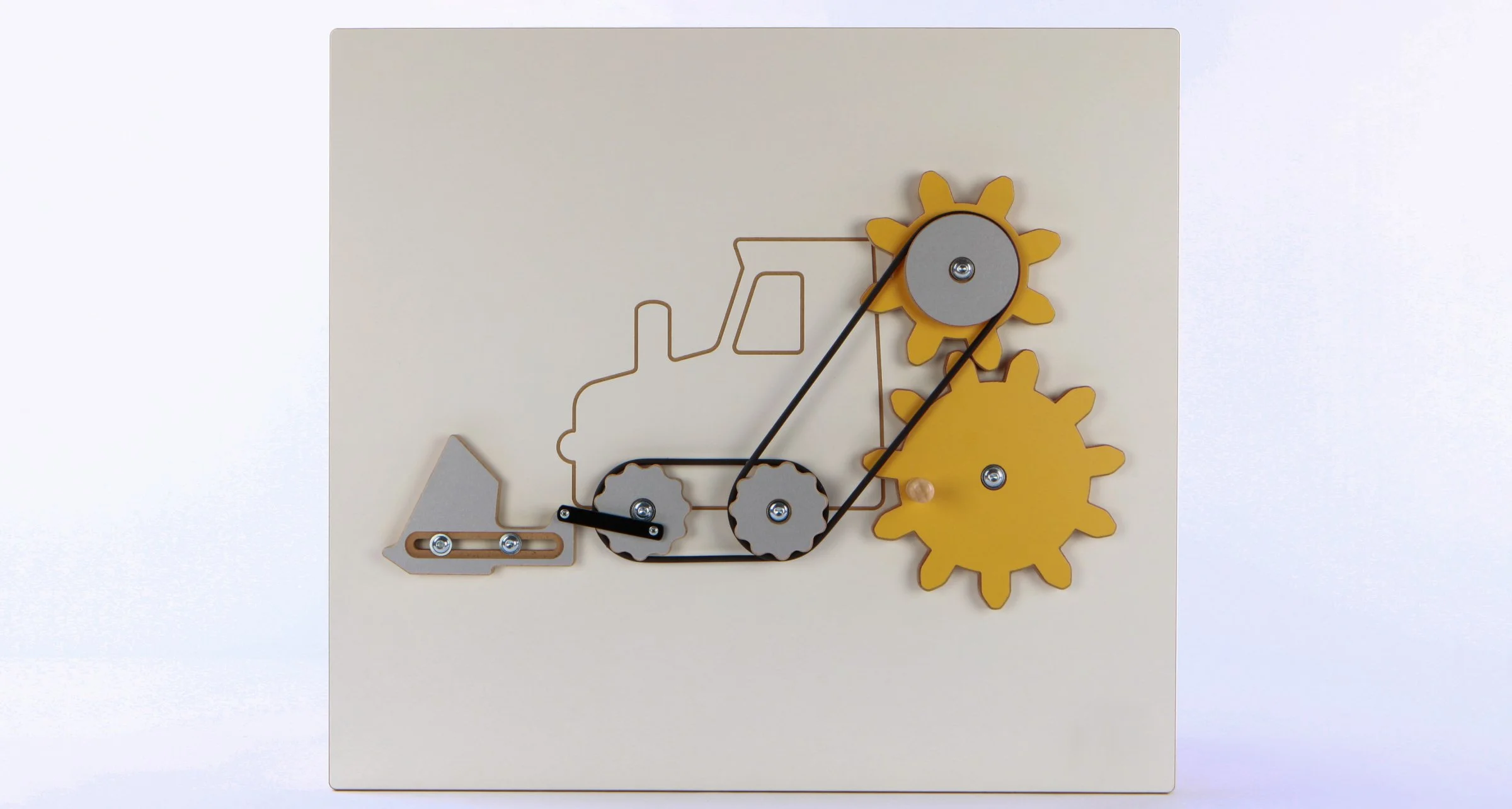 The Bulldozer Panel is equipped with interlocking gears that set the bulldozer’s bucket in motion when turned. It promotes logical thinking and problem-solving skills. Its smooth surface can also be decorated with dry-erase markers, adding a creative dimension to play.