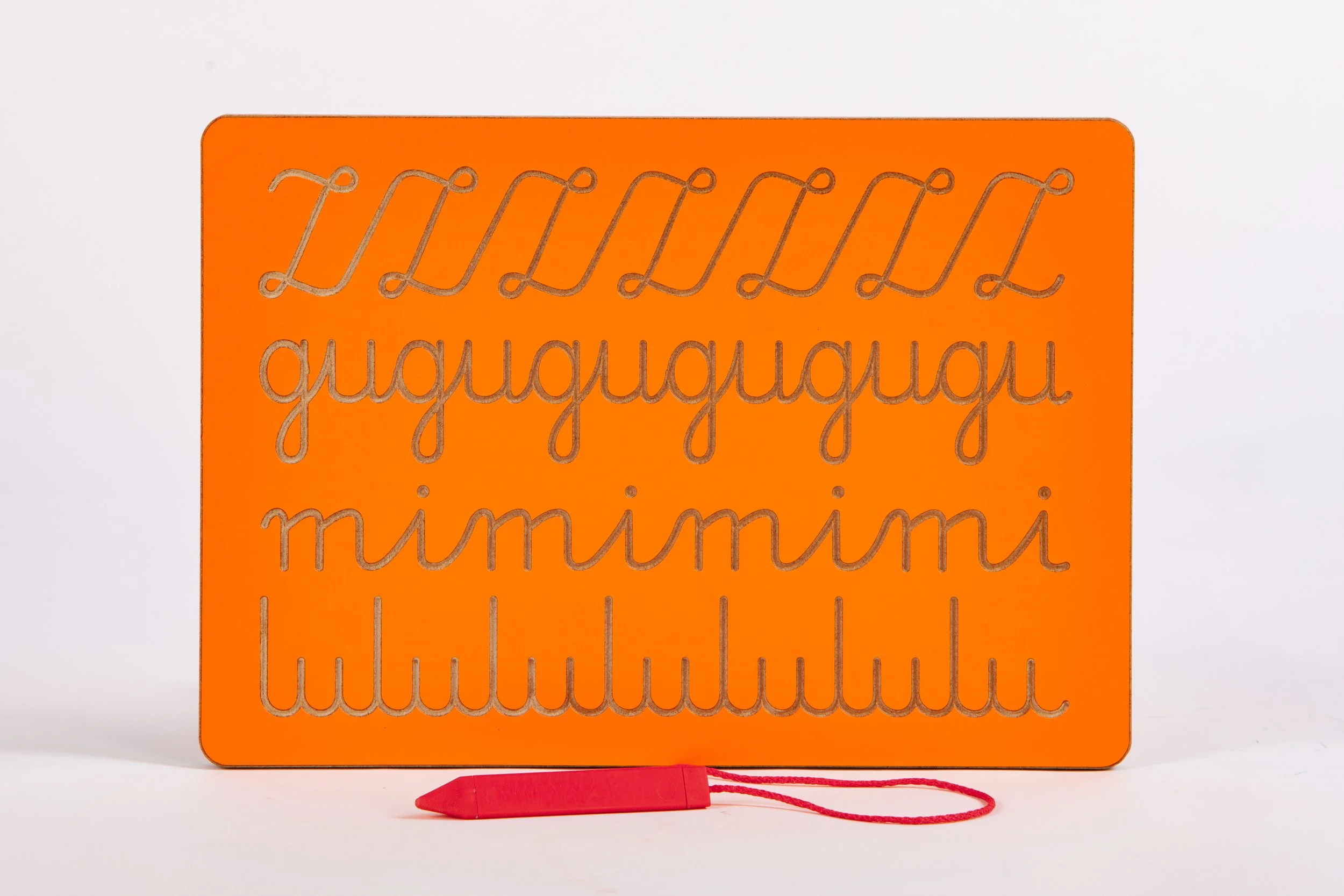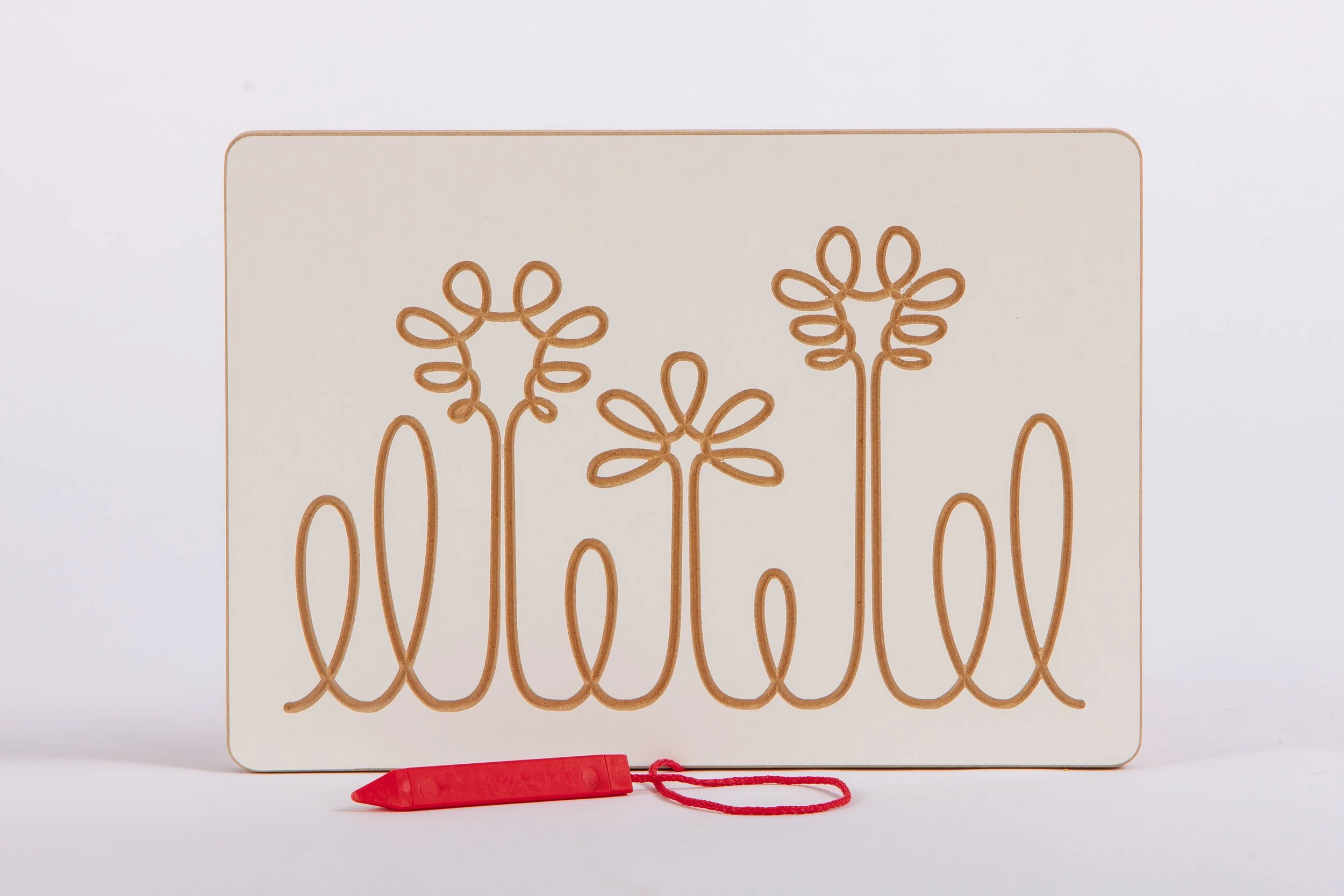 The First Words Graphic Board is designed to prepare children for writing. A grooved path carved into the MDF surface guides a wooden stylus, encouraging correct hand movements and developing pre-writing motor skills.
