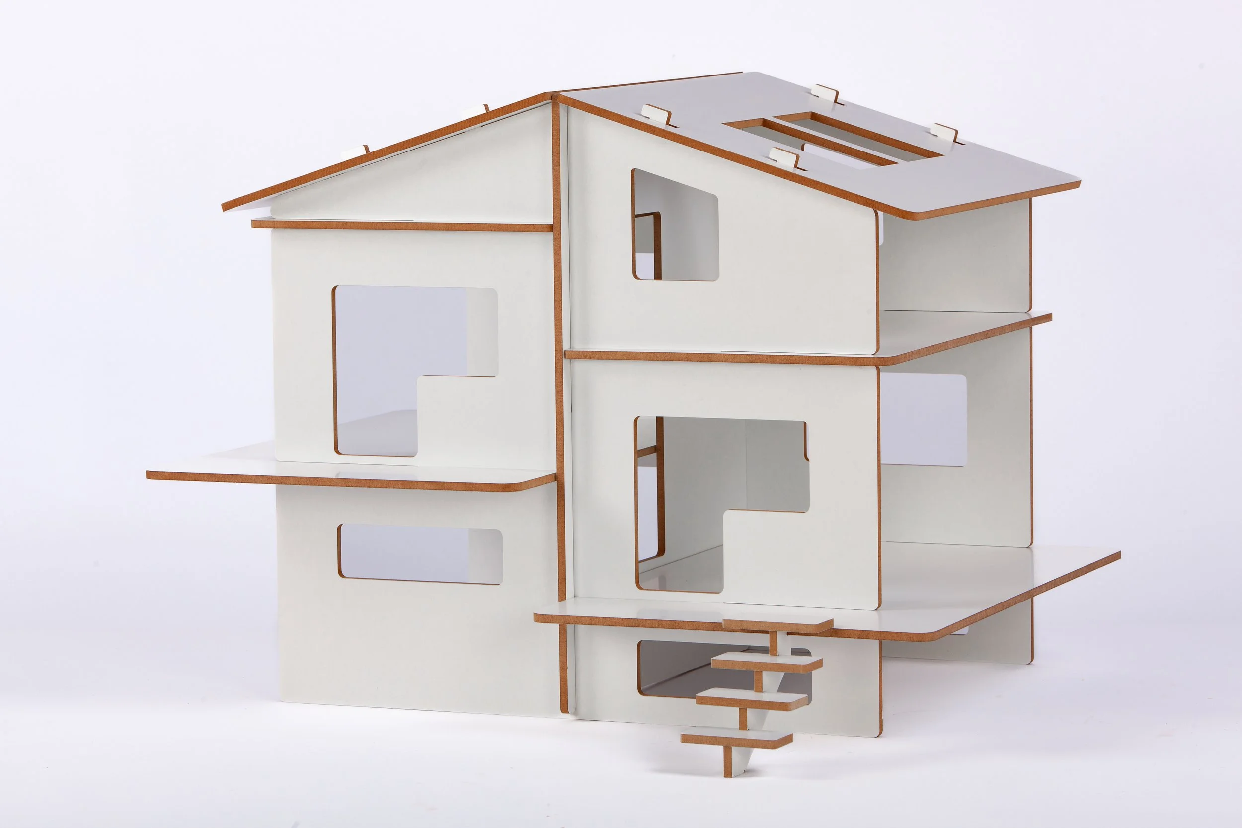 The White Dollhouse is a stable, two-level playhouse with an airy, openwork design. Sold without accessories, it allows children to furnish and decorate the interior freely, encouraging creativity and imaginative play.