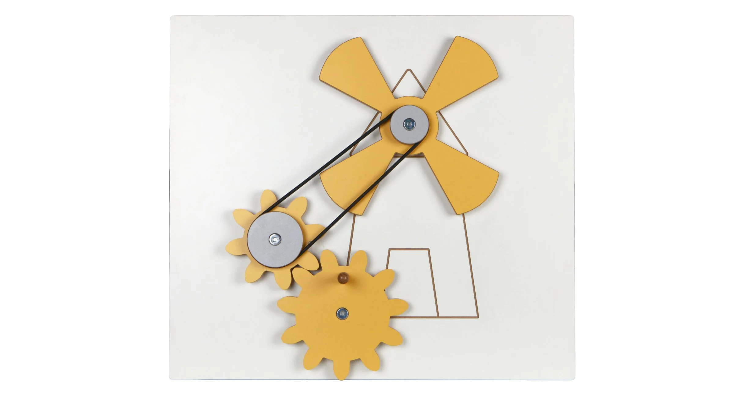 The Windmill Panel features interlocking gears that spin the blades of the windmill when rotated. It supports logical thinking and mechanical curiosity. The smooth surface can be personalized with dry-erase markers, encouraging creativity alongside hands-on exploration.