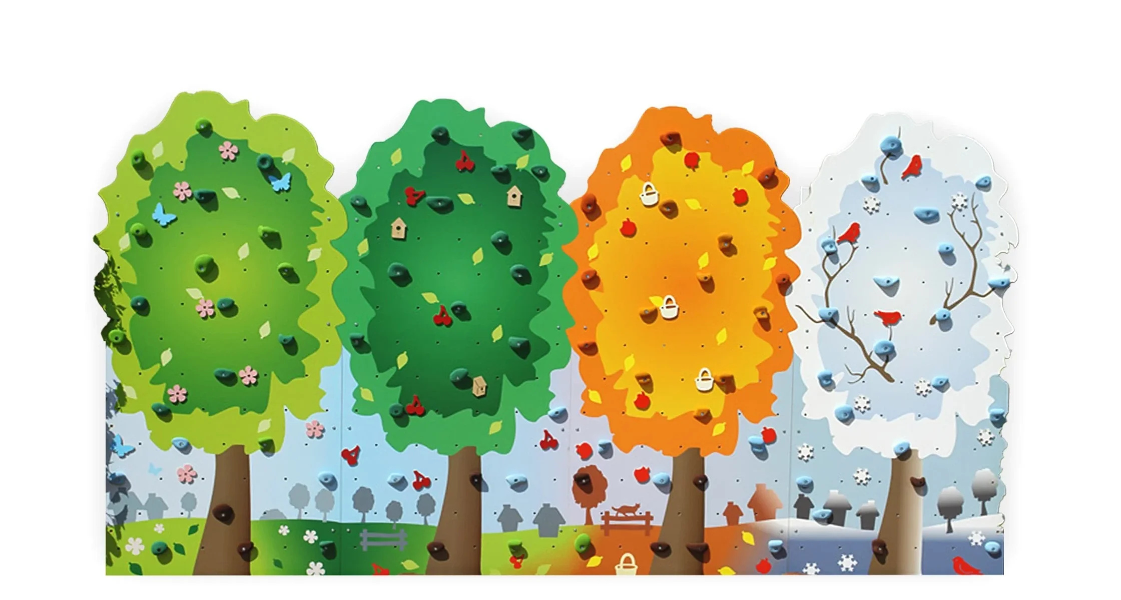 The “Four Seasons” Climbing Wall brings the beauty of spring, summer, autumn, and winter to climbing activities. Each panel is decorated with UV-printed graphics and equipped with professional climbing holds. Constructed from waterproof plywood and sealed with lacquer, the walls offer both resilience and aesthetic appeal.