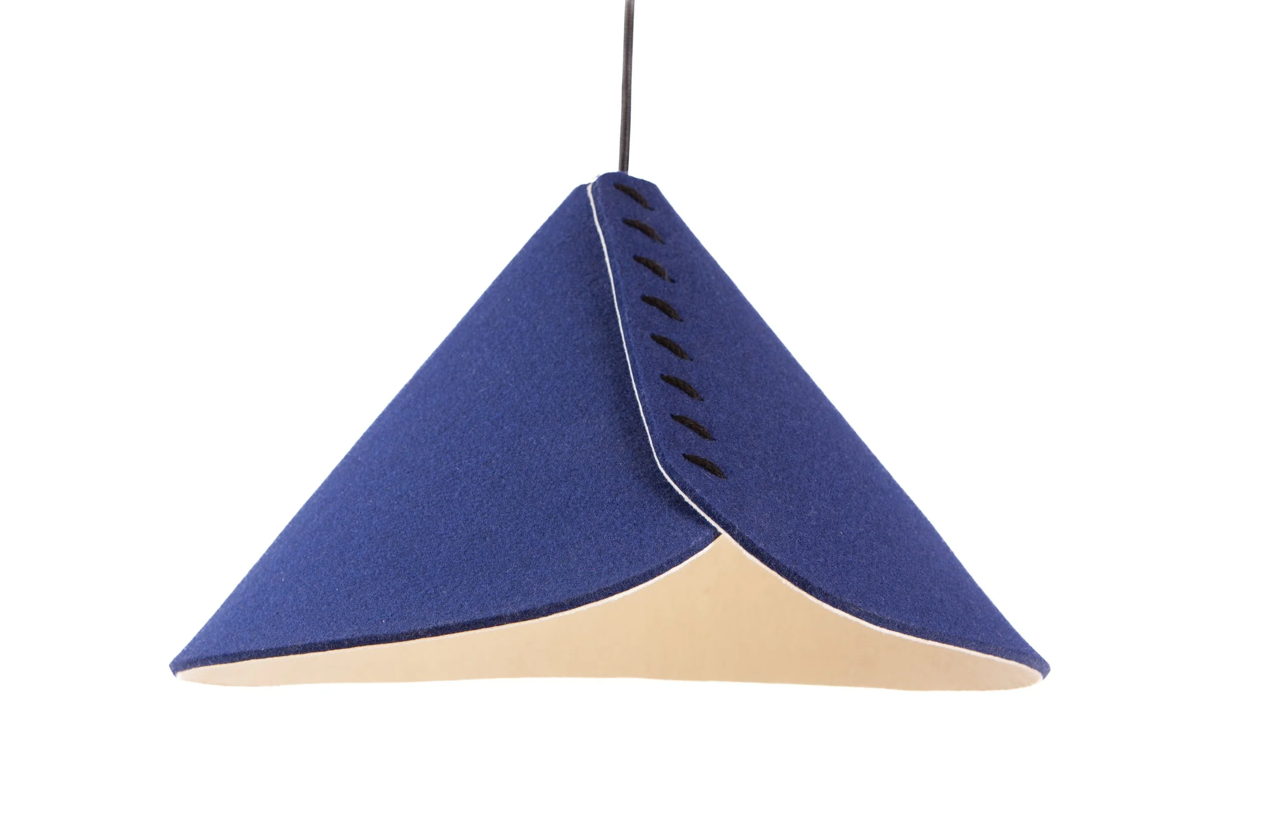 Lampa w kształcie trójkąta. Ramy są wykonane z metalu i malowane proszkowo na kolor czarny lub biały. Instalacja elektryczna jest dopasowana kolorystycznie do ram. Każda lampa może być zamontowana do sufitu za pomocą regulowanych stalowych linek. Klosze lampy są wykonane z miękkiego filcu, z widocznymi szwami. Wnętrze kloszy jest jasne, co kontrastuje z żywymi kolorami zewnętrznymi.