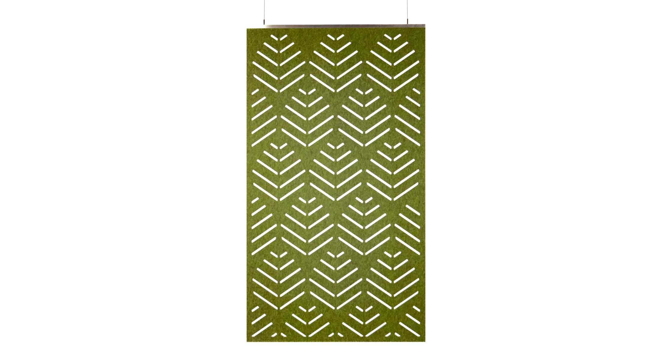 Hanging acoustic panel made of 12 mm thick felt. The surface features an openwork chevron geometric pattern across the entire plane. The top edge is reinforced with a glued aluminum C-channel containing a cable suspension system. The product is designed for vertical division of office spaces.