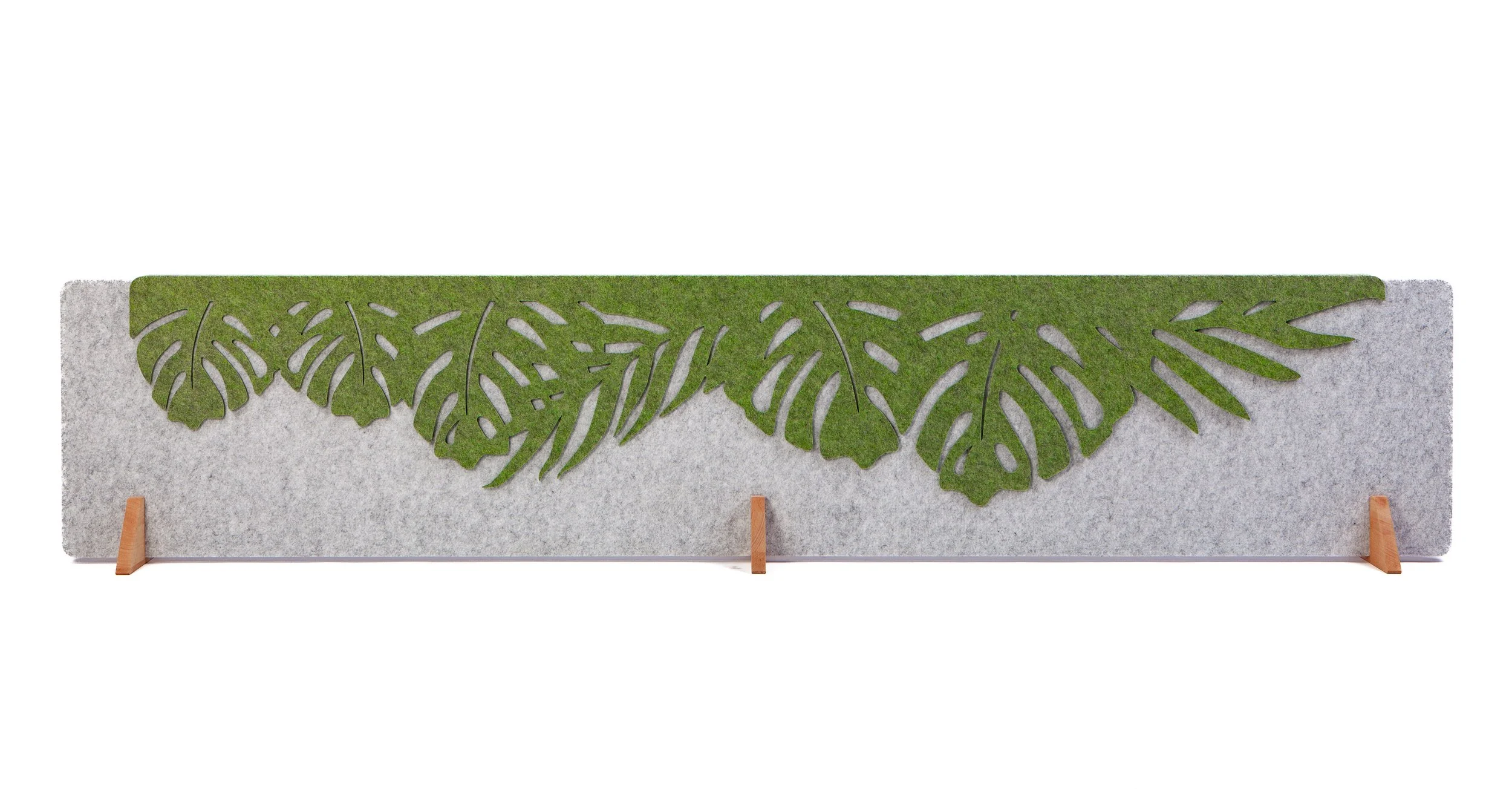 Acoustic desk partition made of 24 mm thick grey felt. The product features a decorative 9 mm thick green overlay with precision-cut monstera and fern leaf motifs. The overlay is mounted by sliding it onto the top edge of the base panel. Structural stability is provided by three slide-on bases made of solid wood with a triangular profile.