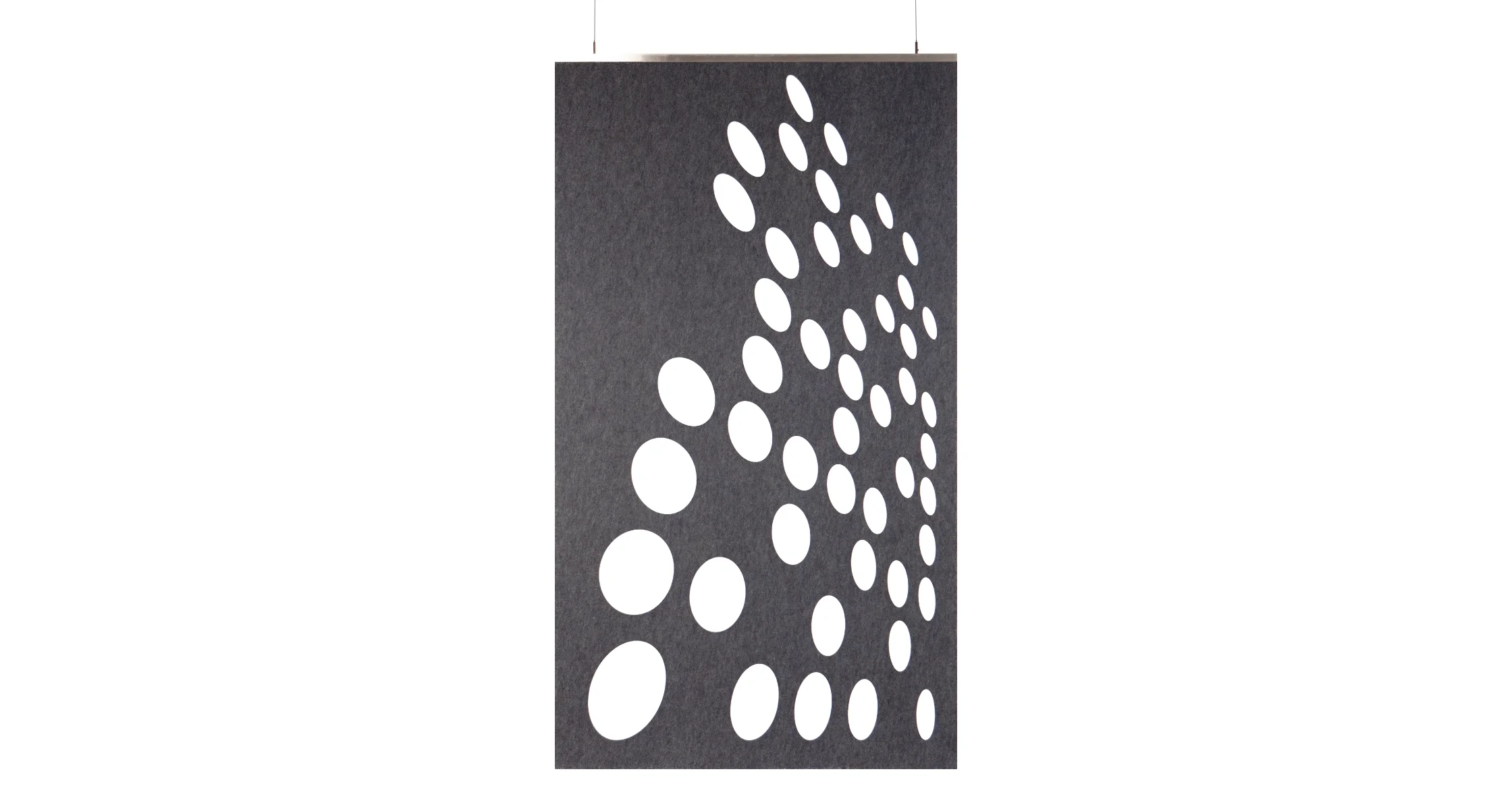 Hanging acoustic panel made of 12 mm thick felt. The pattern is formed by irregularly arranged circular cutouts of varying diameters. The structure features a glued aluminum C-channel with fitted steel hangers for ceiling mounting. The element is used to improve reverberation parameters and reduce interior transparency.