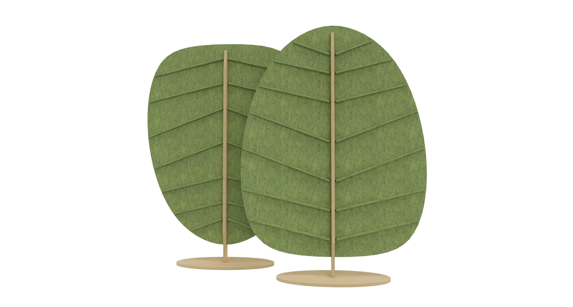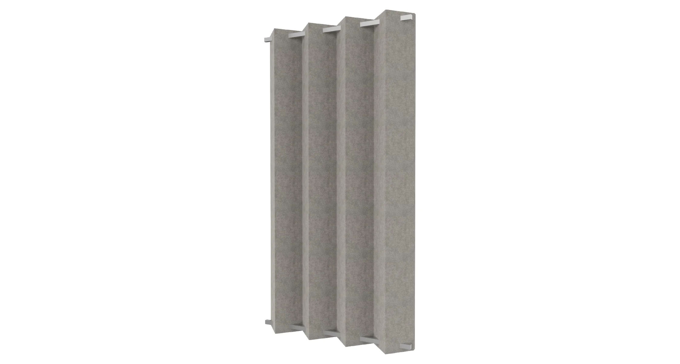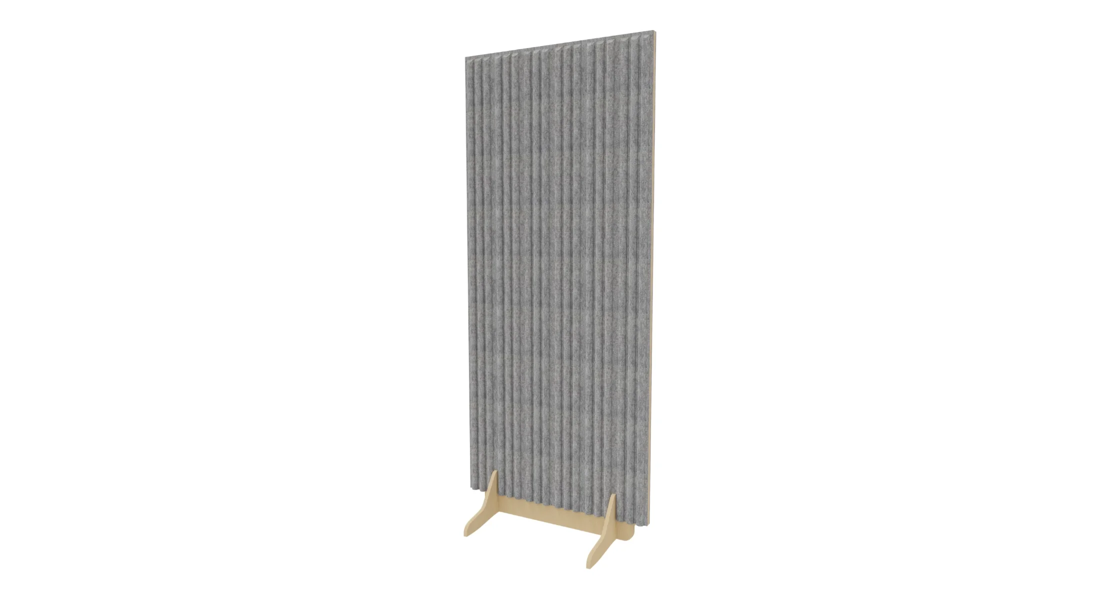 A free-standing acoustic screen with a layered construction. The core of the product is made of 15 mm thick poplar plywood, with thermoformed panels featuring vertical ribbing bonded to both sides. The unit is mounted on two stabilizing feet made of poplar plywood, attached using a press-fit method.