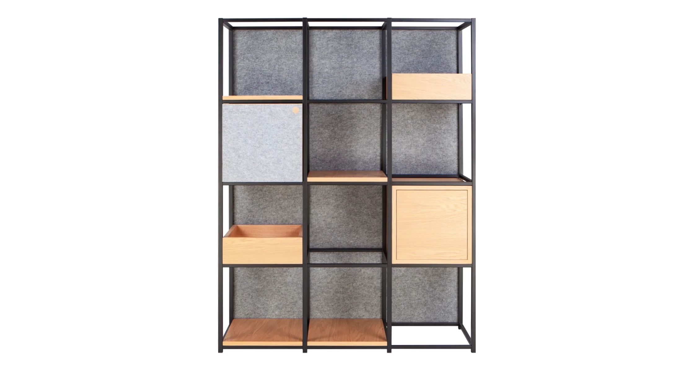 MOKO FELT is a modular system evolution designed specifically for dynamic office environments. By incorporating PET felt back panels, the classic shelving unit transforms into a effective room divider. It allows for the aesthetic and effective zoning of open-plan offices, conference rooms, or breakout areas without the need for permanent structural walls. The system is based on a structural grid of steel profiles, manufactured using precision 3D laser technology. The use of PET felt panels not only provides a contemporary "soft" aesthetic but also significantly improves interior acoustics by helping to dampen ambient noise in busy office settings.