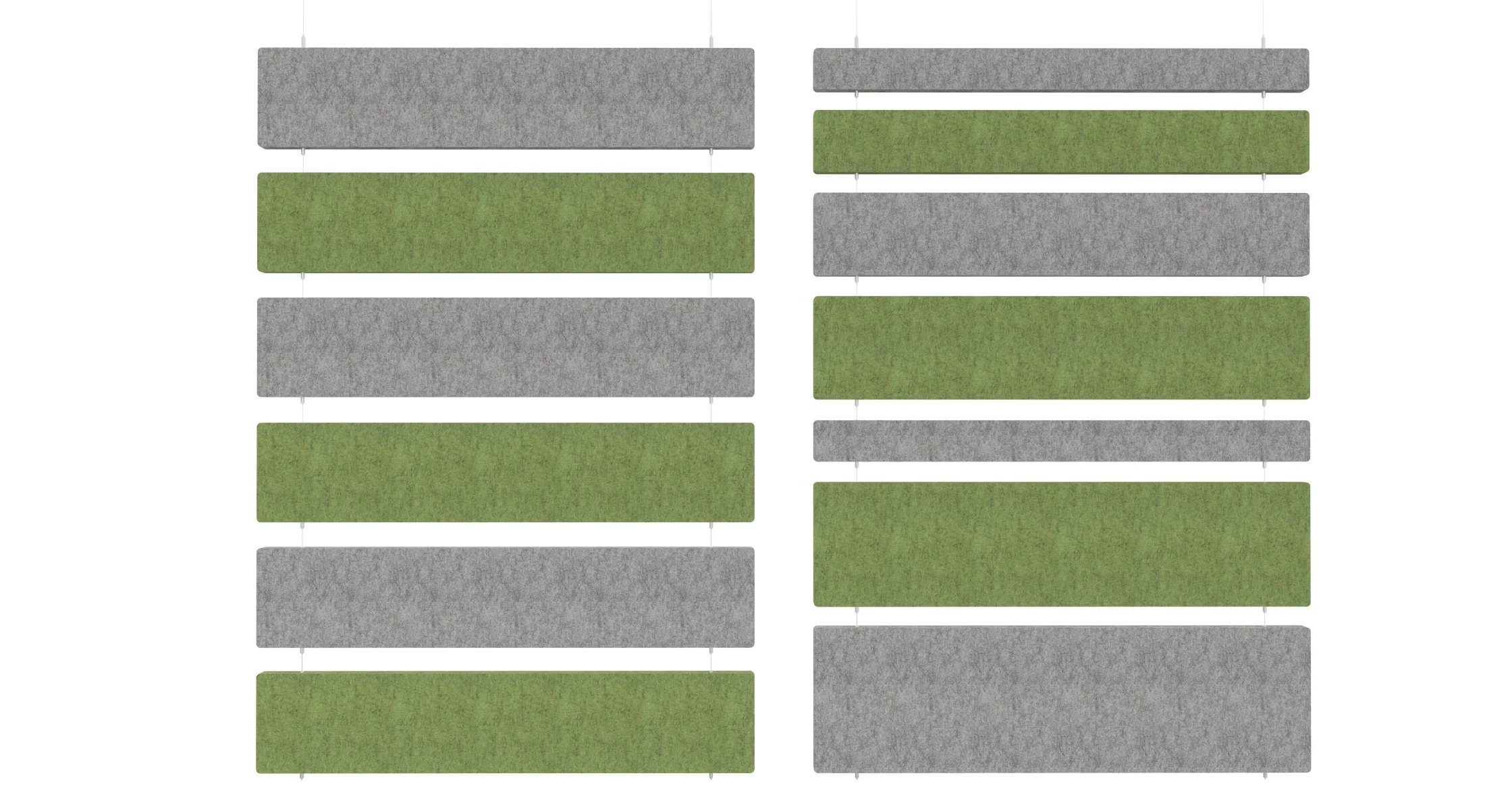 Hanging acoustic partition made of thick 24 mm felt. The panel features symmetrical horizontal slot-style cutouts arranged in vertical sections. The entire unit is suspended on a steel cable system attached to the top edge of the material, allowing for ceiling mounting. The product is designed for sound dampening and architectural zoning of office spaces.